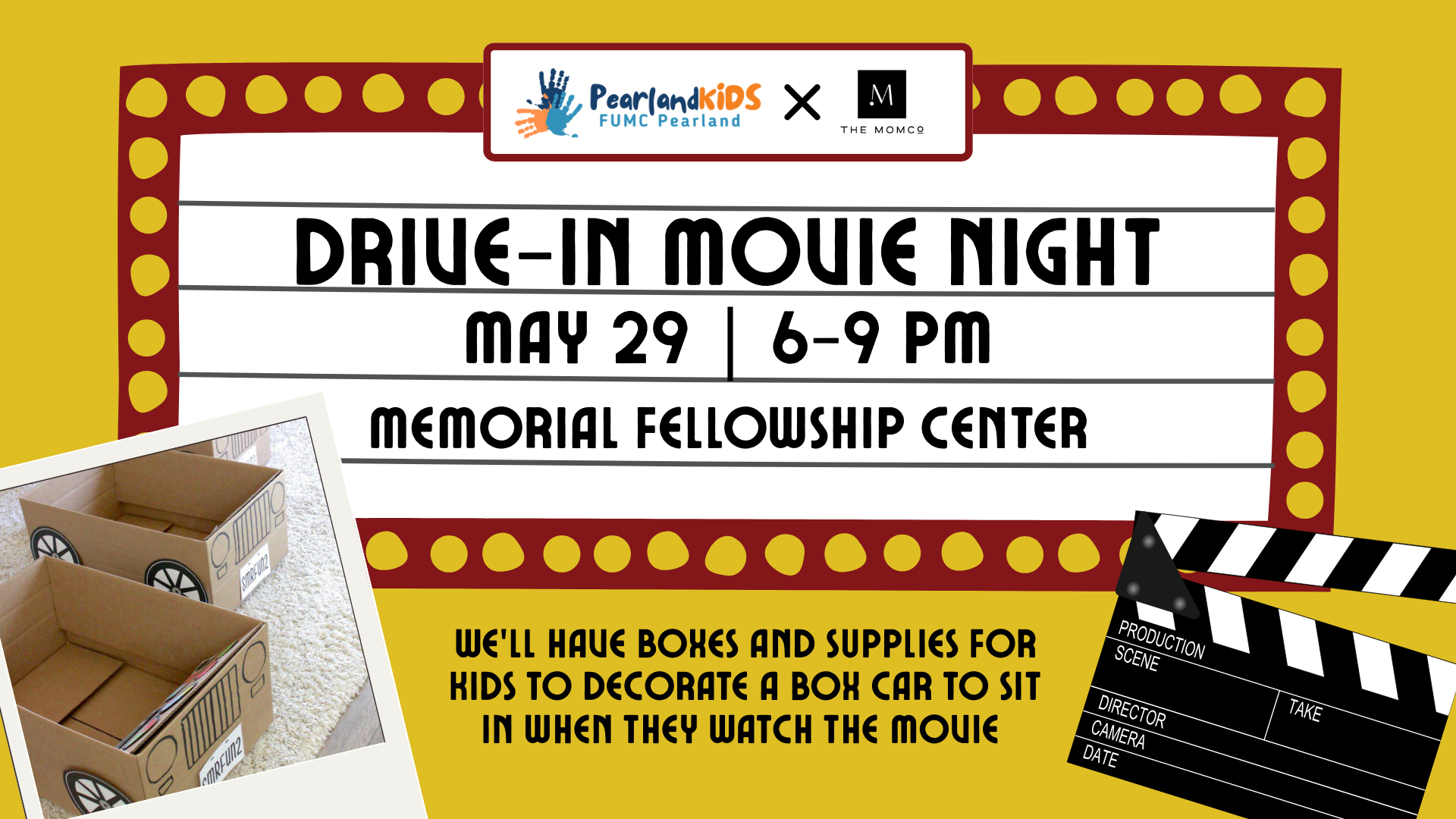 PearlandKIDS and MomCo are teaming up to bring you FUMC's first drive-in movie night on Friday, May 29! We'll have boxes and supplies for kids to decorate a box car to sit in while we watch a movie.